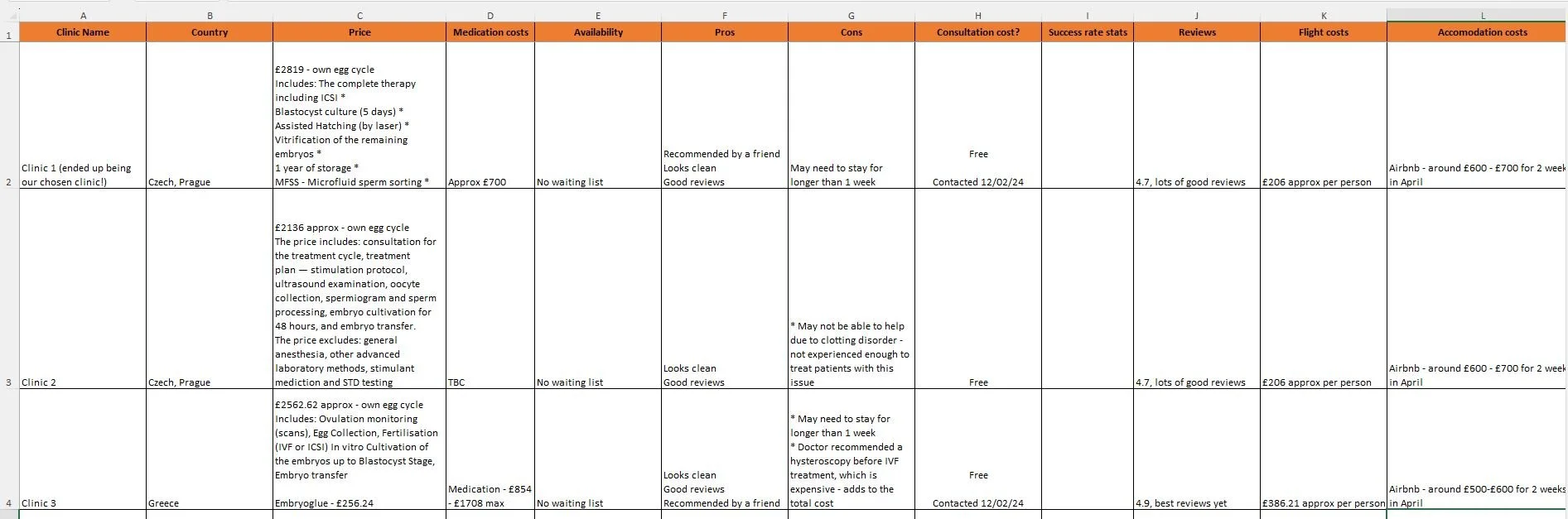 We started to search on Google for clinics in Greece, Prague and Spain first, as we had seen that these countries were highly recommended for successful IVF treatment at competitive prices. I created a good old trusty Excel spreadsheet, to make it easier to compare the information that we were looking through - when you start looking through IVF information, it pretty much makes no sense whatsoever! You see things like ICSI, PGT testing, day 5 blastocyst... honestly, my head was spinning by the time we went through things the first time. Here’s an example of the information I added to the spreadsheet: